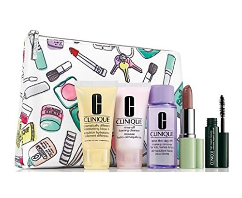 Clinique Signature Printed Cosmetic Bag, Mini Dramatically Different Moisturizing Lotion+, 30 ml, Rinse Off Foaming Cleanser Take The Day Off Makeup Remover For Lids, Lashes & Lips, Long Last Lipstick in Bamboo Pink, Mini High Impact Mascara in Black