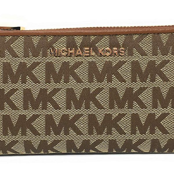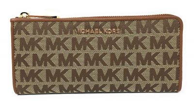 Michael Kors Jet Set Travel Large Three Quarter Zip Around Wallet is made of dual tone monogram printed jacquard fabric with polished hardware. It zips along the right side and across the top with an accordion pleated side on the left. The front is accented with Michael Kors iconic logo.